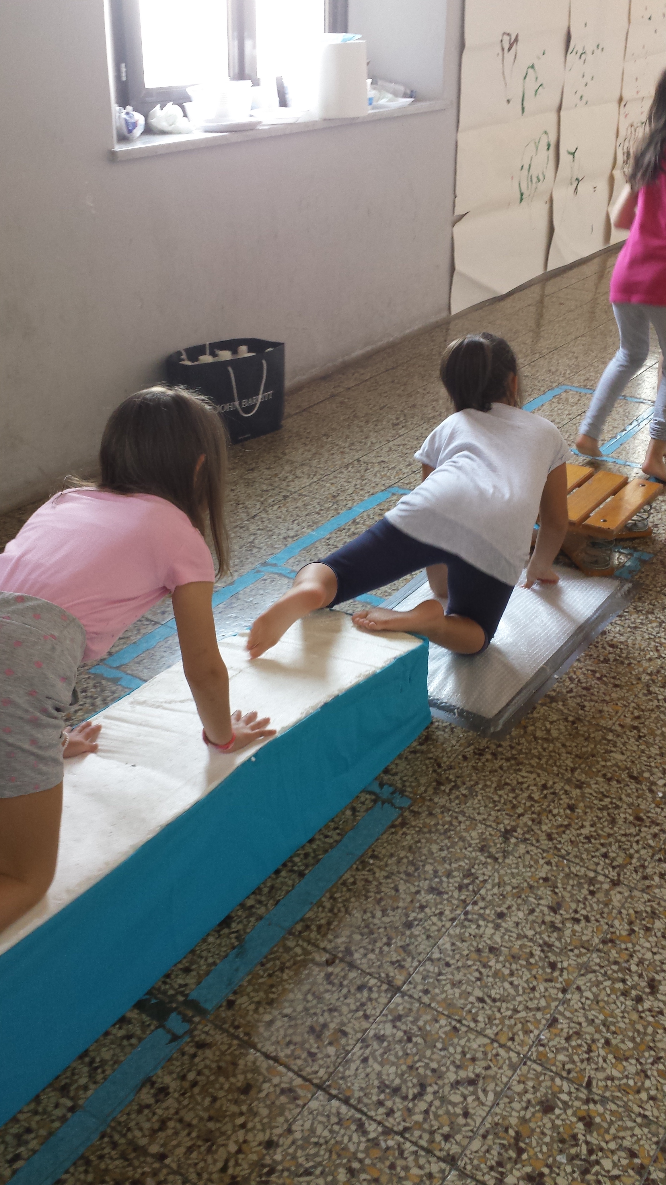 Nel giro di un mese, l’ala non utilizzata della nostra scuola è stata trasformata in un laboratorio sensoriale con percorsi da fare bendati e a piedi scalzi, per “sentirne” le varie superfici, con ostacoli da superare e ragnatele di nastro da oltrepassare. E ancora materiali da toccare, infilando le mani nelle fessure poste su delle scatole o oggetti appesi alle pareti e da sfiorare, per capirne l’essenza e la natura, tutto in un’aula buia, dove, durante l’attività, improvvisamente si incrociava una luna piena semplicemente guardando dal buco ricavato in una enorme scatola! E poi odori e spezie da riconoscere, oggetti e strumenti musicali da costruire con materiali di riciclo e di seguito sentirne i diversi suoni e timbri. O caleidoscopi da puntare verso la finestra per ammirarne le meravigliosissime pluridimensioni colorate ed argentee! E anche dipingere su cartelloni bianchi ma con un uso inconsueto del pennello, tenendolo in bocca o tra le dita dei piedi! Il percorso, almeno per i più piccoli, terminava con un bagno immaginario tra bastoncini di mais colorato, palloncini e tulle variopinti sistemati in una piscina di plastica che poteva contenere anche 5 o 6 bambini.